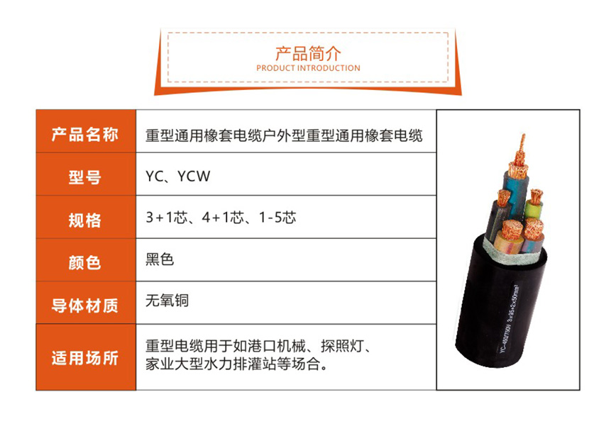橡套電纜分為重型橡套軟電纜(YC電纜,YCW電纜),中型橡套軟電纜(YZ電纜,YZW電纜),輕型橡套軟電纜(YQ電纜,YQW電纜),防水橡套軟電纜(JHS電纜,JHSB電纜),電焊機(jī)電纜(YH電纜,YHF電纜)YHD電纜為野外用鍍錫電源連接線。